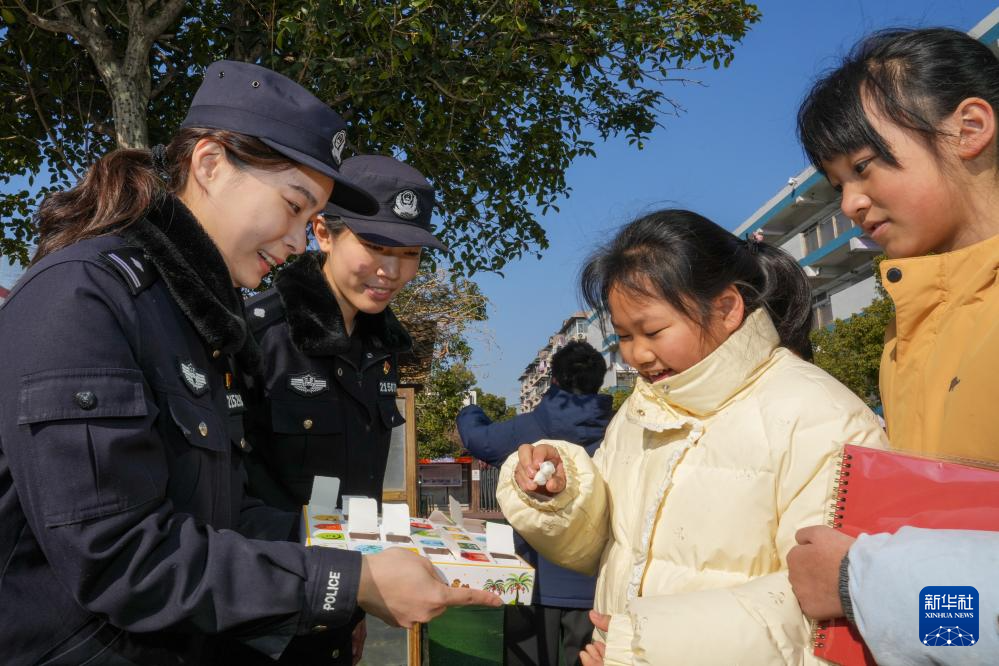 1月9日,南京市公安局建邺分局南湖派出所民警在辖区内一所学校进行“平安进校园”主题110宣传日活动。