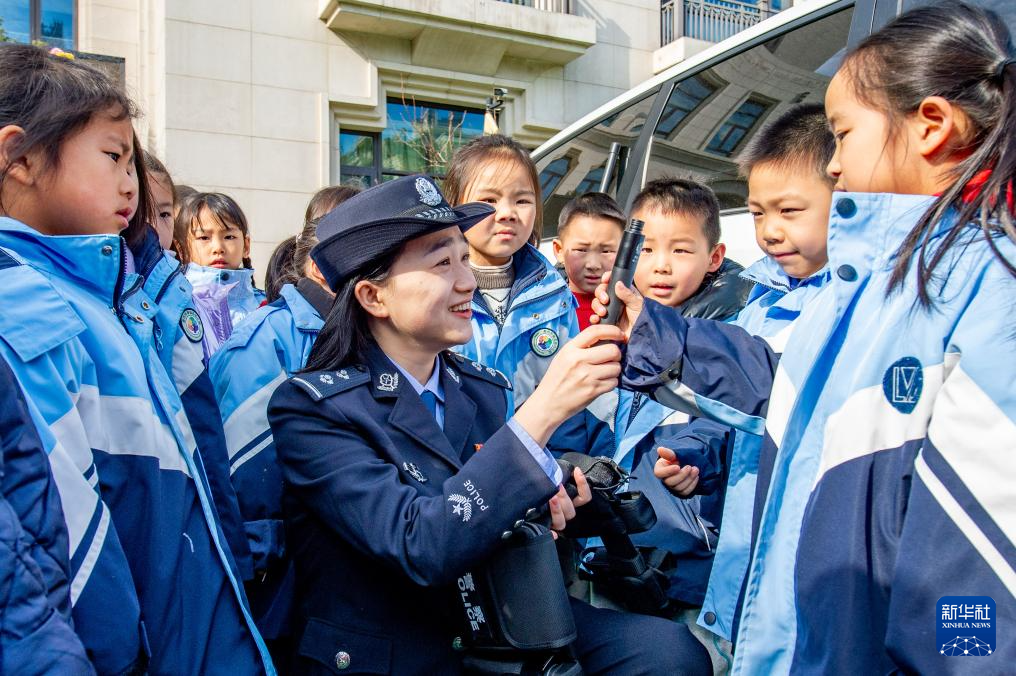 1月9日,在江苏省泰州市御园路幼儿园,泰州市公安局泰州医药高新区分局凤凰派出所民警给小朋友介绍警用装备。