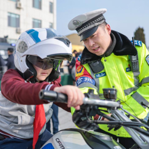 1月9日,安徽省合肥市公安局交通管理支队蜀山大队女子铁骑民警走进合肥市翠庭园小学宣传交通安全知识。