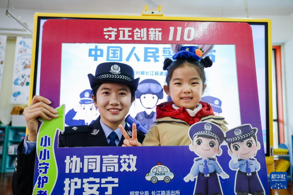 1月9日,安徽省铜陵市公安局铜官分局长江路派出所民警与铜陵市人民幼儿园小朋友互动交流。