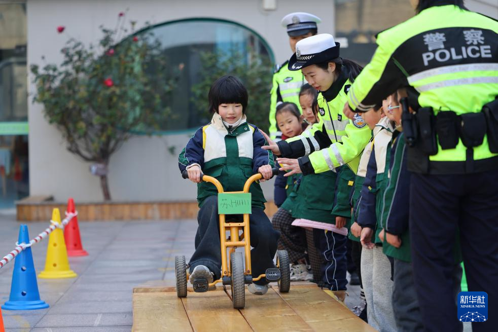 1月9日,交警在江苏省泰州市儿童教育实验中心指导小朋友学习交通安全知识。