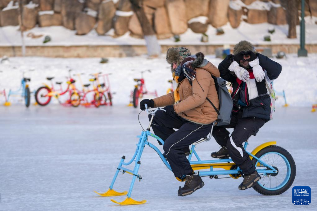 1月8日,外国游客在太阳岛雪博会园区体验冰上自行车。