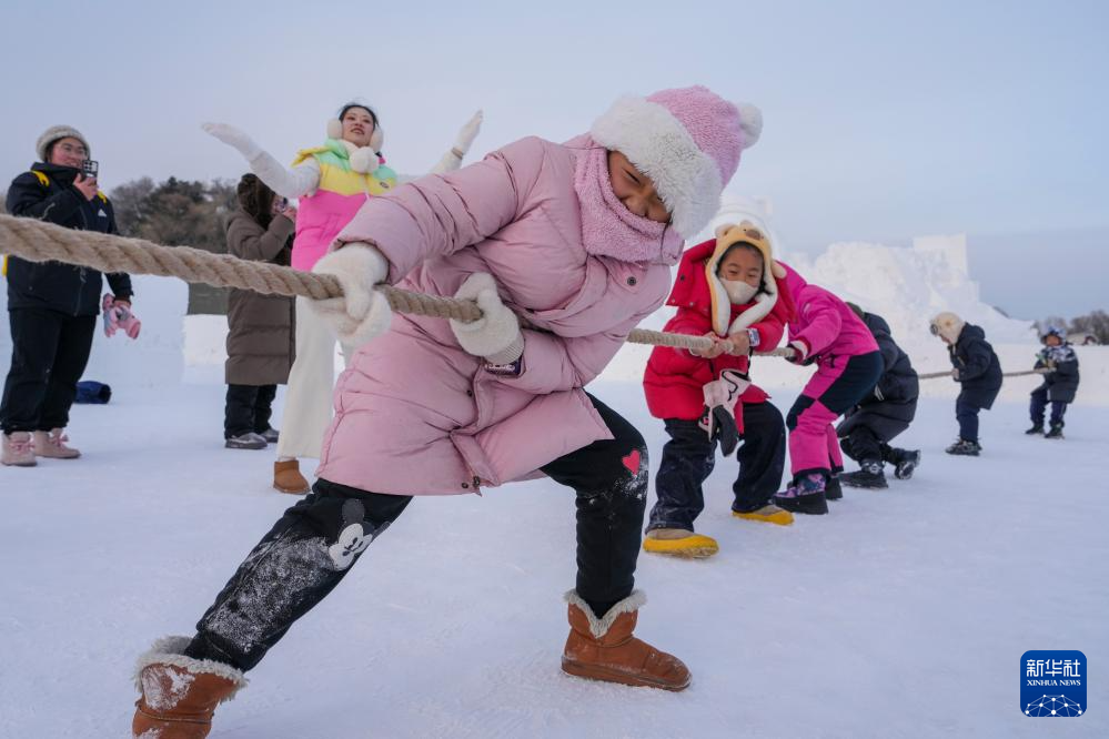 1月8日,小朋友在太阳岛雪博会园区玩雪地拔河。