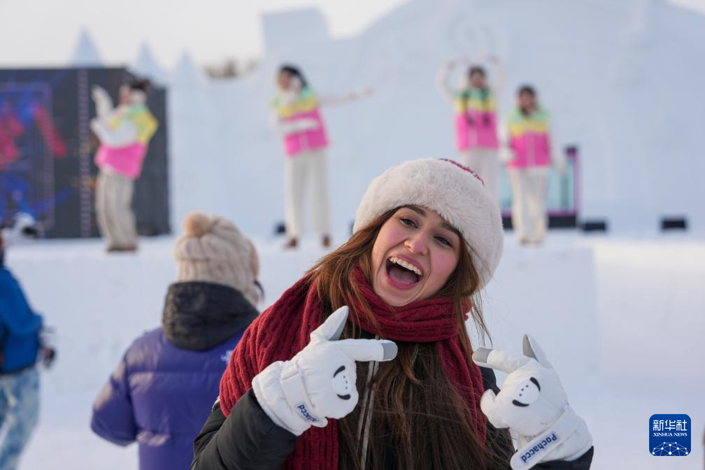 1月8日,外国游客在太阳岛雪博会园区随着梦幻雪舞台播放的音乐唱歌跳舞。