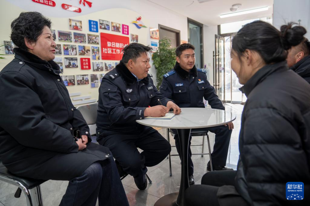 1月8日,金盾苑警务站民警晋美扎巴(左二)和同事在社区服务群众。