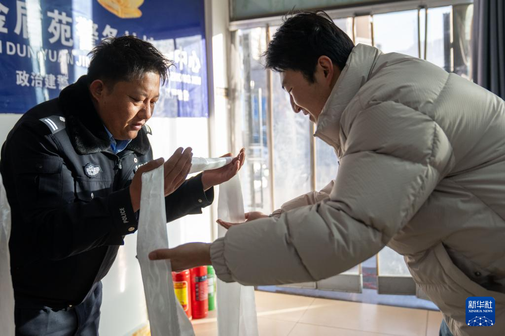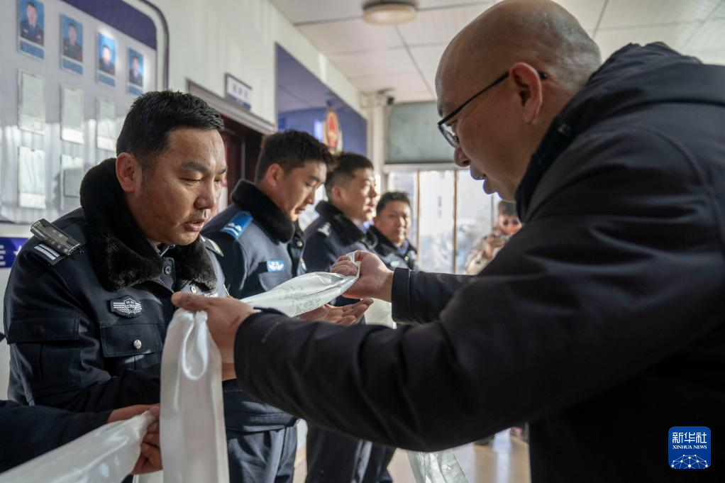 1月9日,市民向金盾苑警务站民警扎西顿珠(左一)敬献哈达。