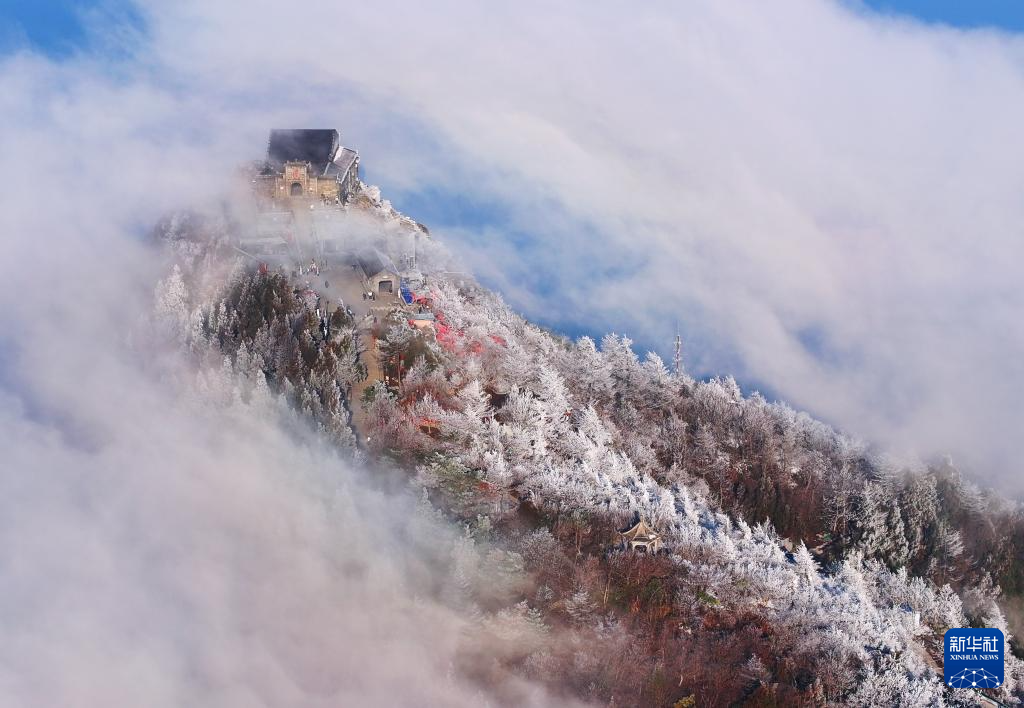 1月6日在南岳衡山风景区拍摄的雾凇云海景观(无人机照片)。