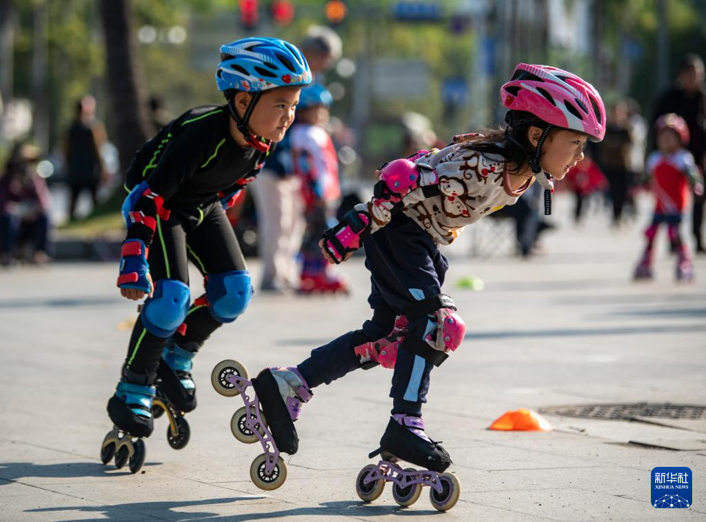 1月9日,小朋友在海南省琼海市万泉河公园练习轮滑。