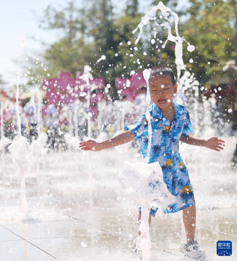 1月9日,小朋友在海南省三亚南山文化旅游区喷泉处戏水玩耍。