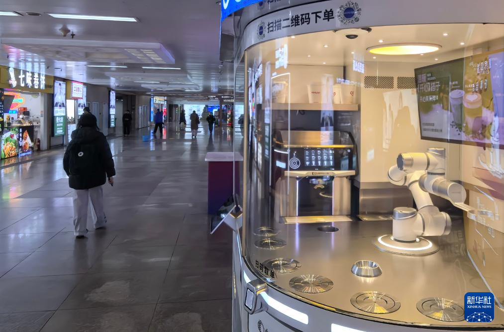 这是北京地铁国贸站内的一家机器人自动售货咖啡店(1月9日摄,手机照片)。