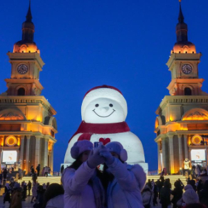 时下,“冰城”哈尔滨市正值冰雪旅游旺季。位于哈尔滨市群力音乐公园的大雪人吸引着众多游客前来打卡。日落后的蓝调时刻,在天光与灯光的交相映照下,大雪人更显浪漫迷人。