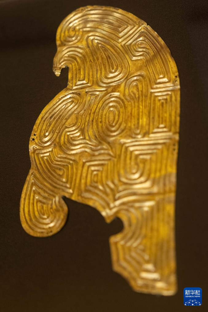 1月13日在展览上拍摄的甘肃省博物馆藏鸱鸟形金饰片。