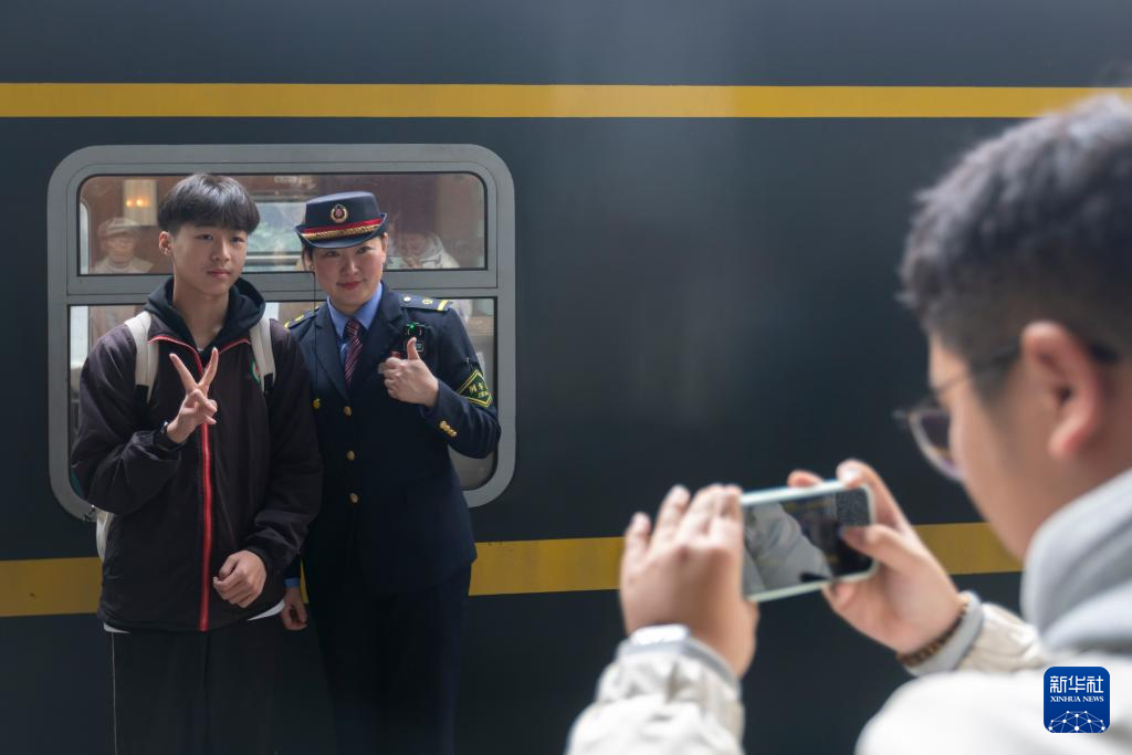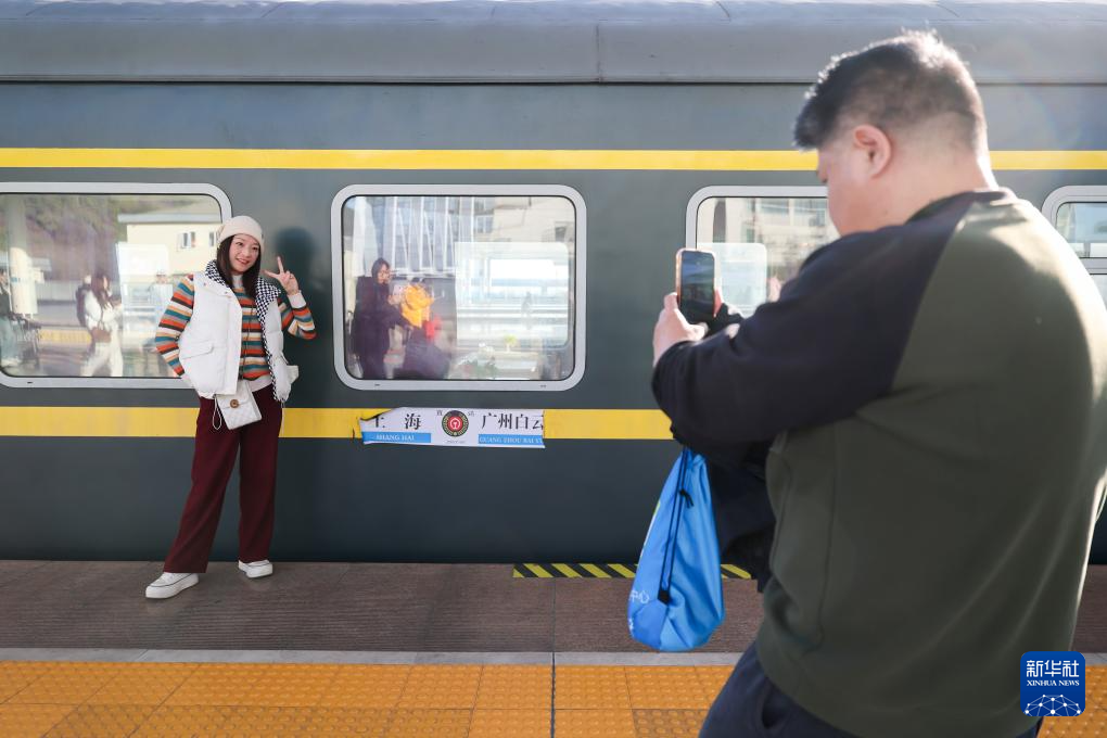 1月14日,旅客在杭州南站站台和Z100次列车合影。