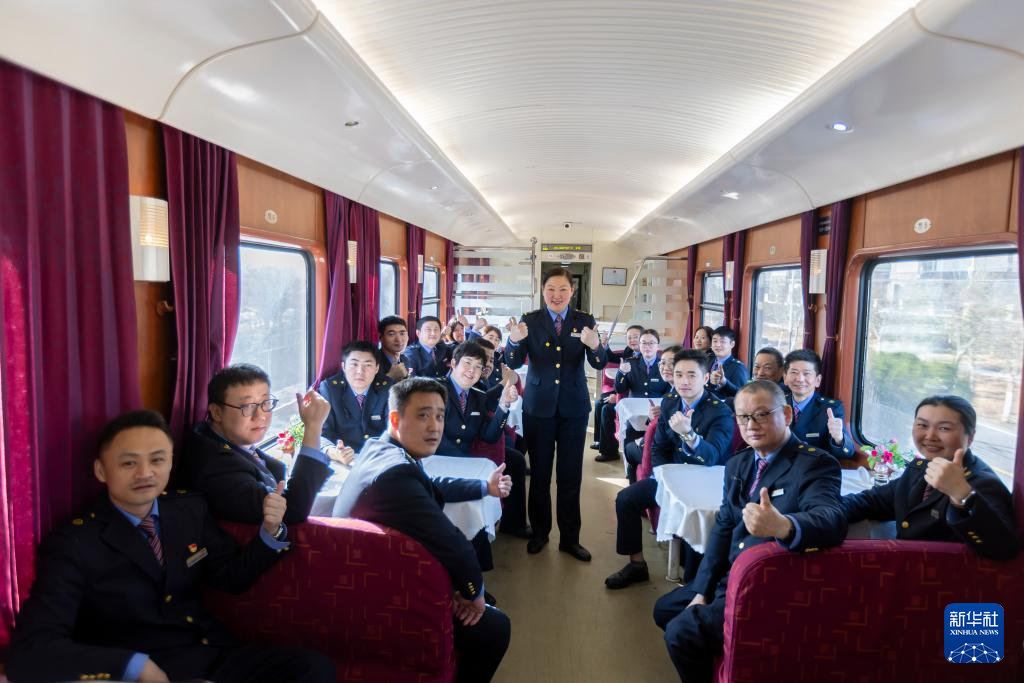1月14日,中国铁路上海局集团有限公司上海客运段沪港车队列车长李喆(中)和乘务人员在餐车合影留念。