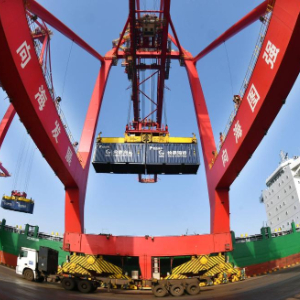 1月15日,在黄骅港综合港区集装箱码头,岸桥设备在进行卸船作业。