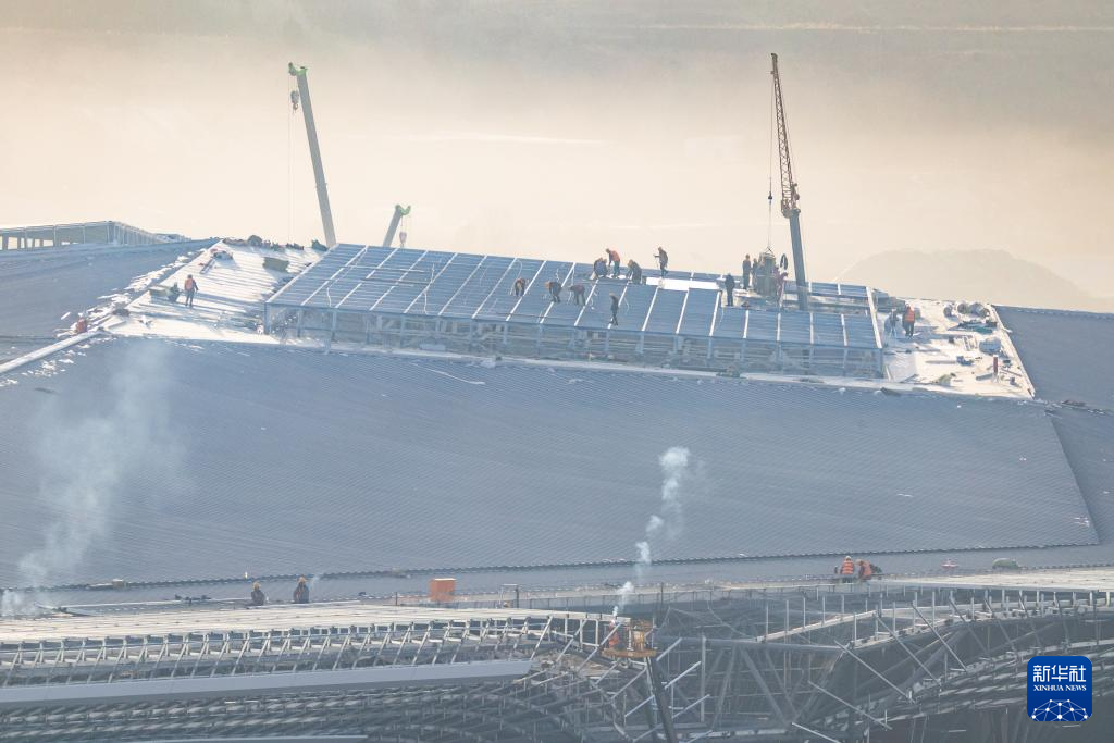 1月15日,施工人员在西安东站金属屋面进行部件安装作业。