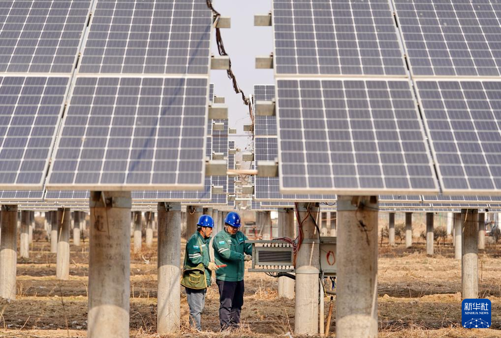 1月16日,国网巨鹿县供电公司的工人在辖区阎疃镇附近的“农光互补”光伏发电场巡检并网线路。