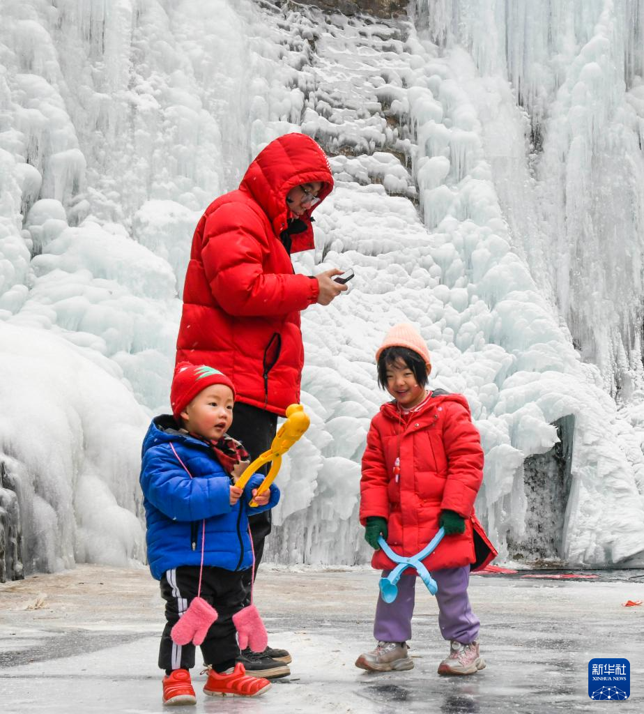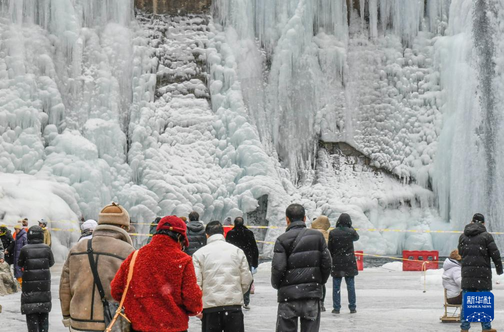 1月18日,人们在河北省承德市兴隆县青松岭镇石门台村附近的冰瀑游玩。