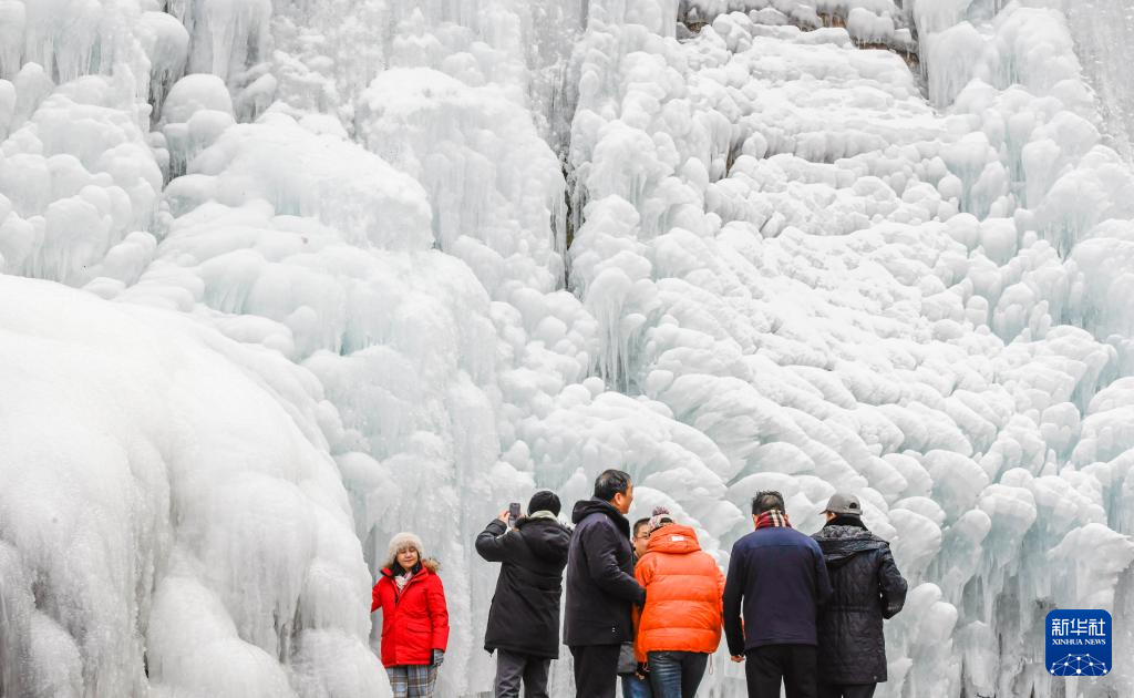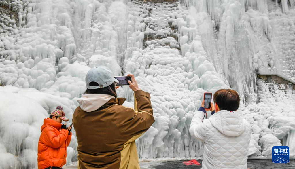 1月18日,人们在河北省承德市兴隆县青松岭镇石门台村附近的冰瀑游玩拍照。