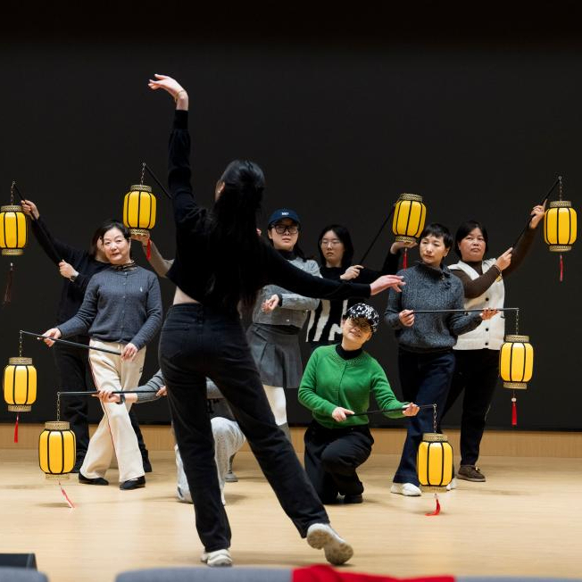 1月19日,在苏州市工人文化宫的多功能厅,企业职工在舞蹈老师带领下排练年会舞蹈。