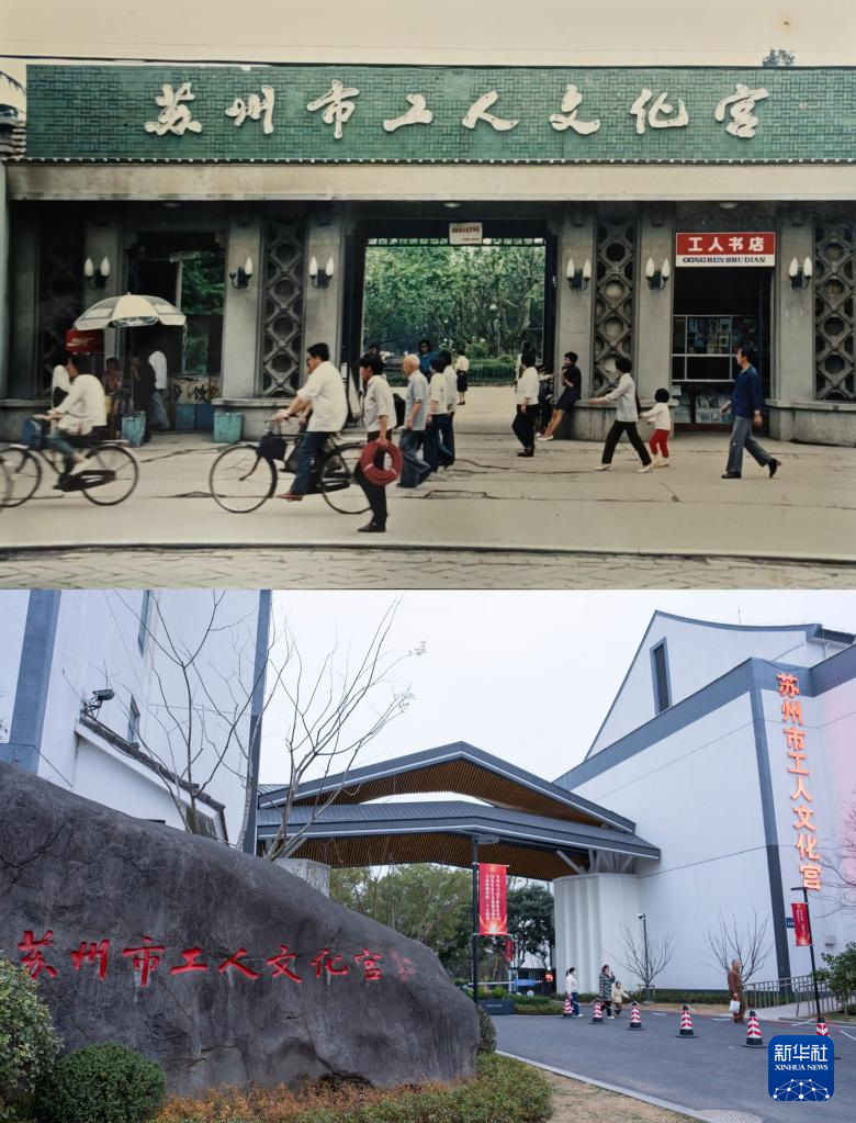 拼版照片:上图为过去的苏州市工人文化宫大门(资料照片);下图为升级改造后的文化宫入口(2026年1月18日摄)。