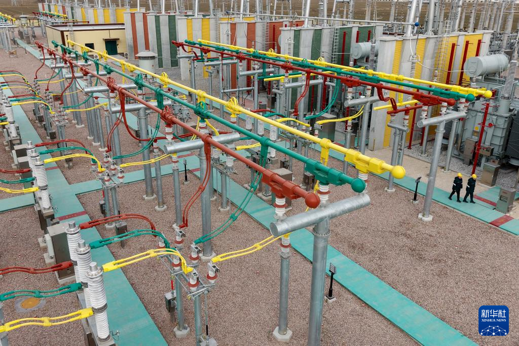 1月19日,工人在位于河北省宁晋县境内的国网邢台北500千伏超高压变电站巡检(无人机照片)。