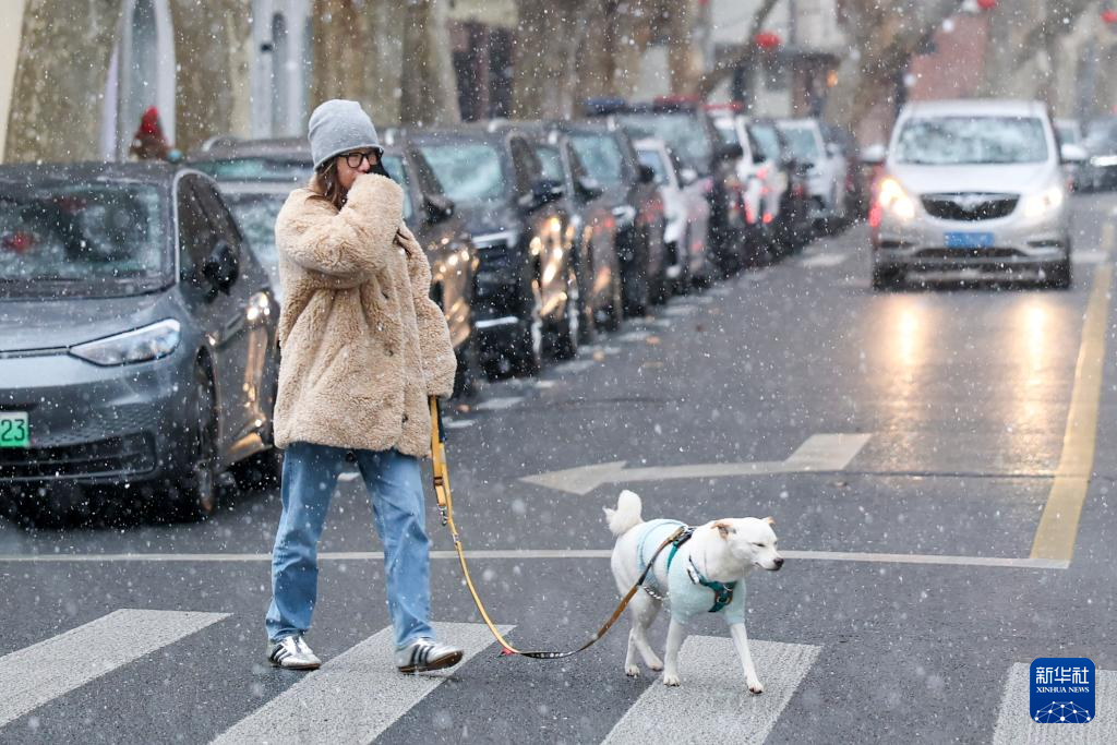 1月20日,市民在上海市徐汇区冒雪遛狗。