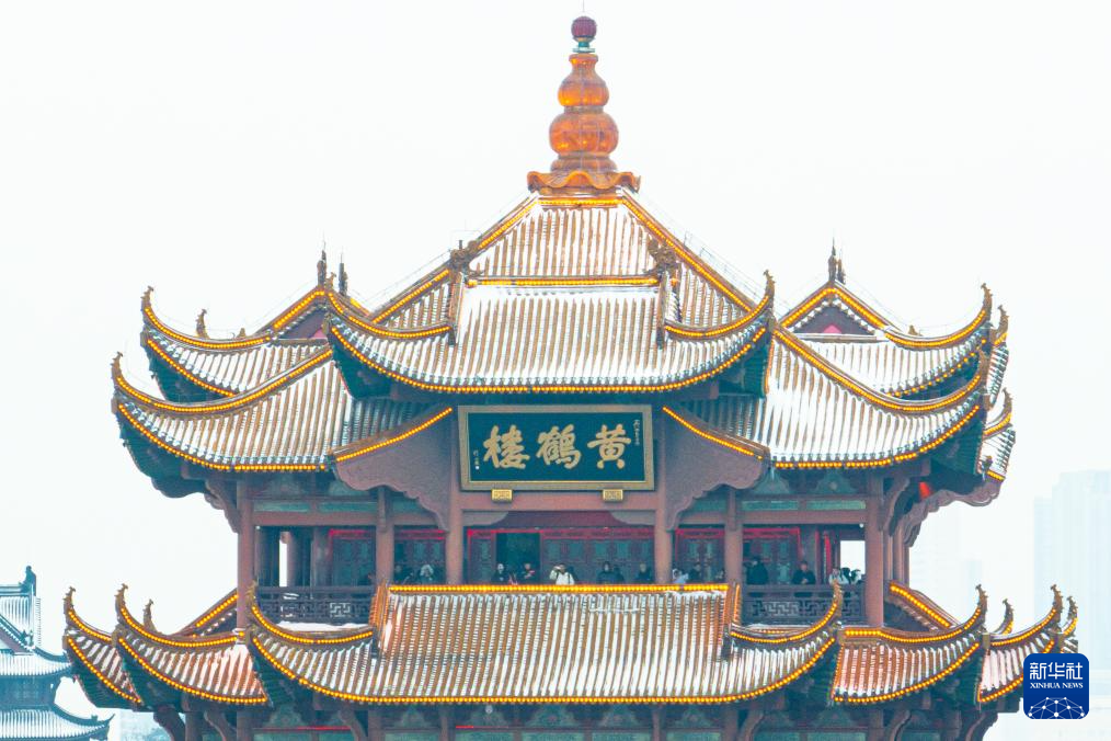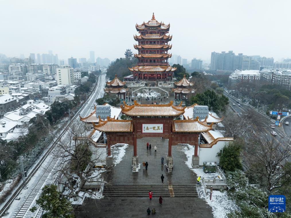1月20日拍摄的武汉黄鹤楼景区雪景(无人机照片)。