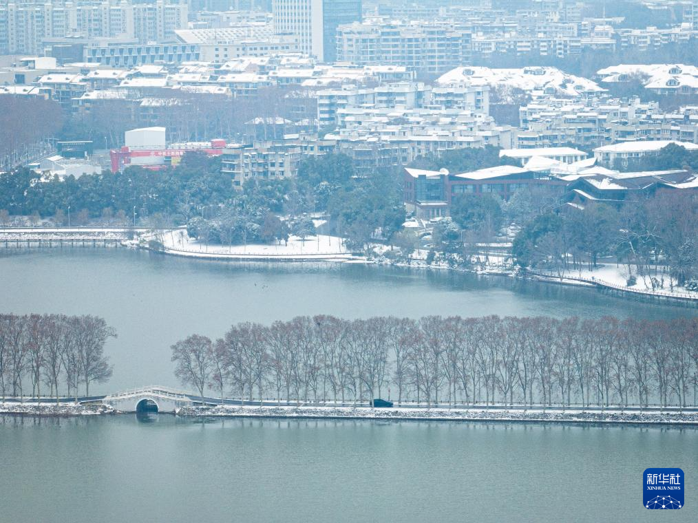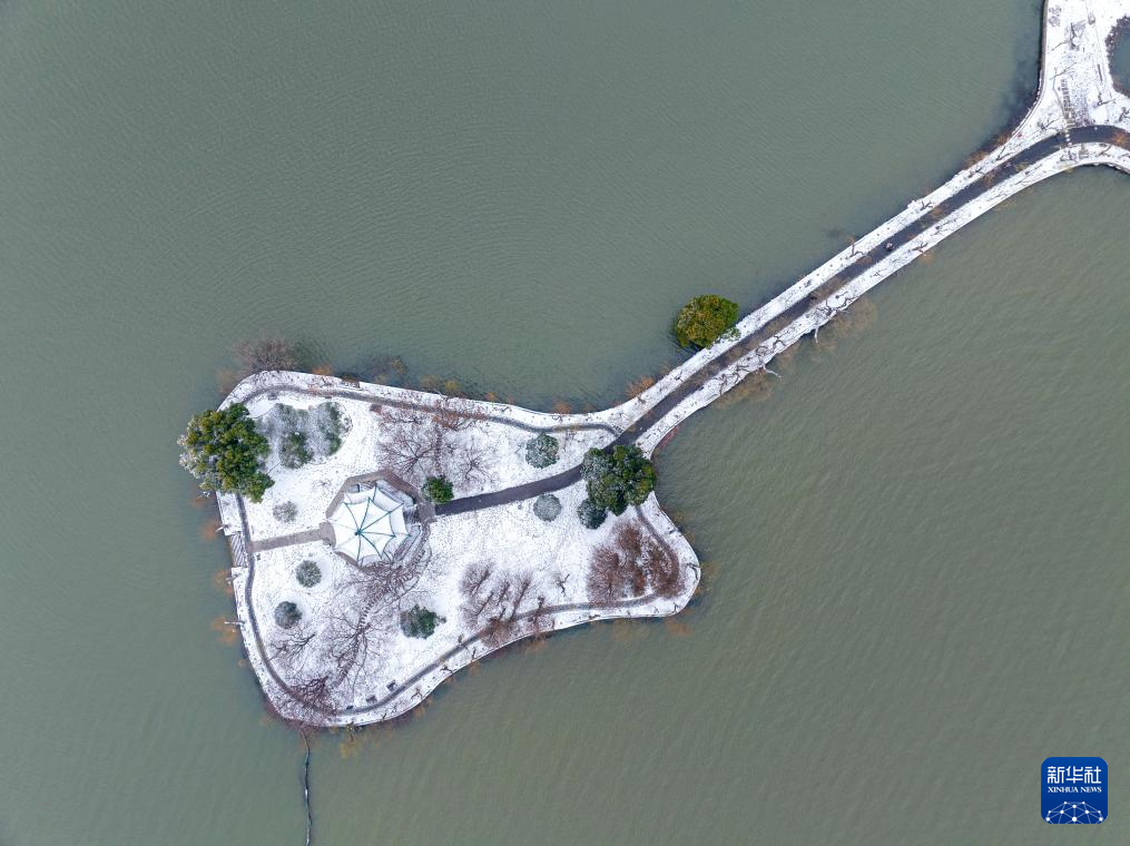 1月20日拍摄的武汉东湖风景区雪景一角(无人机照片)。