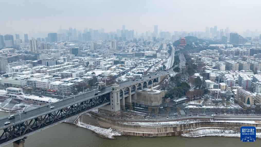 1月20日拍摄的武汉长江大桥雪景(无人机照片)。