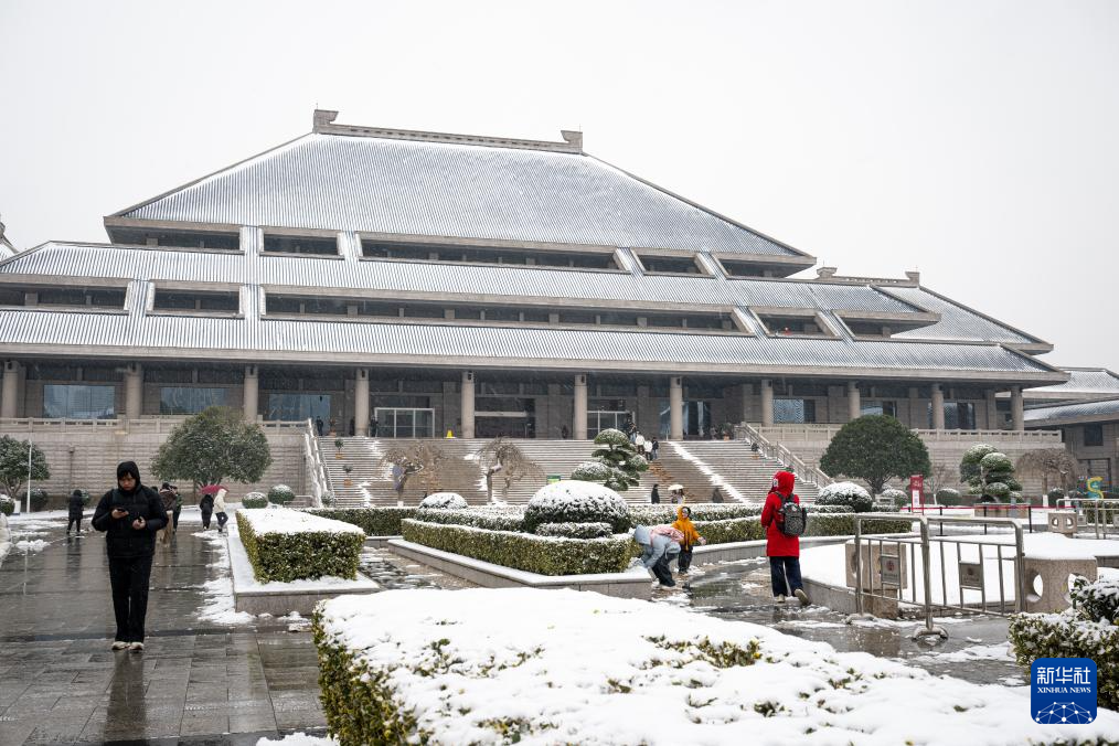 1月20日,人们在位于武汉的湖北省博物馆欣赏雪景。