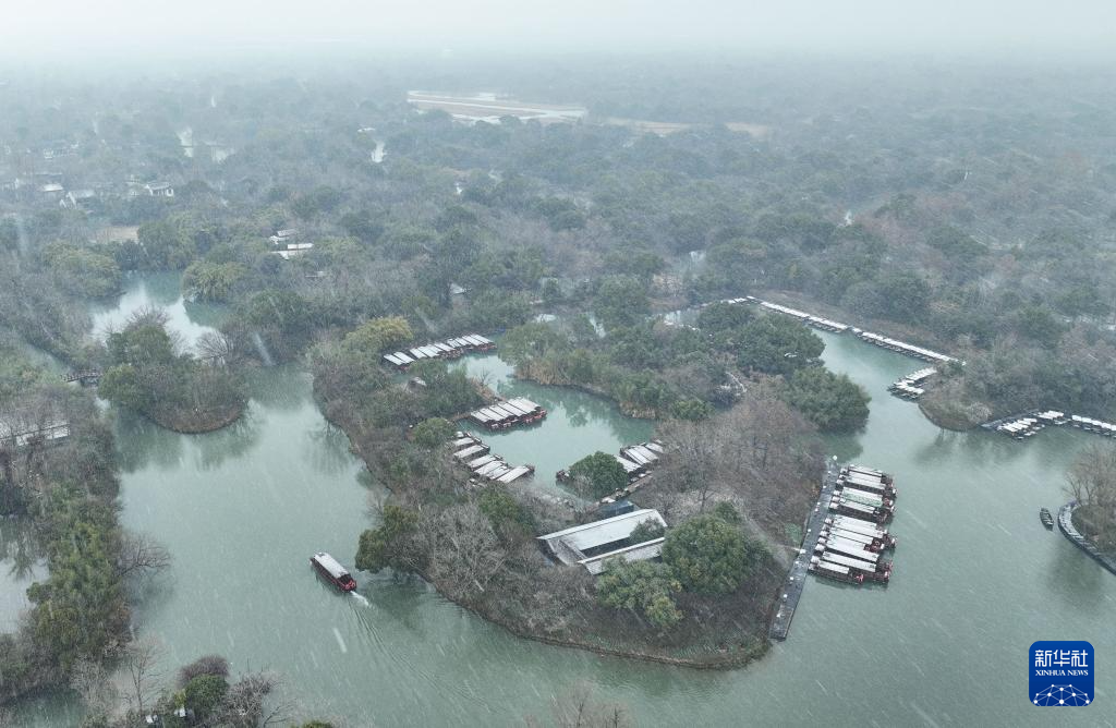 1月20日,在杭州西溪湿地,游船在雪中行驶。