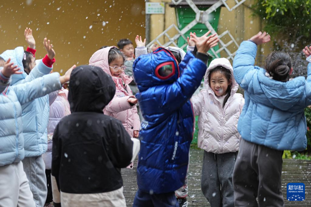 1月20日,杭州市锦绣幼儿园的小朋友在雪中嬉戏。