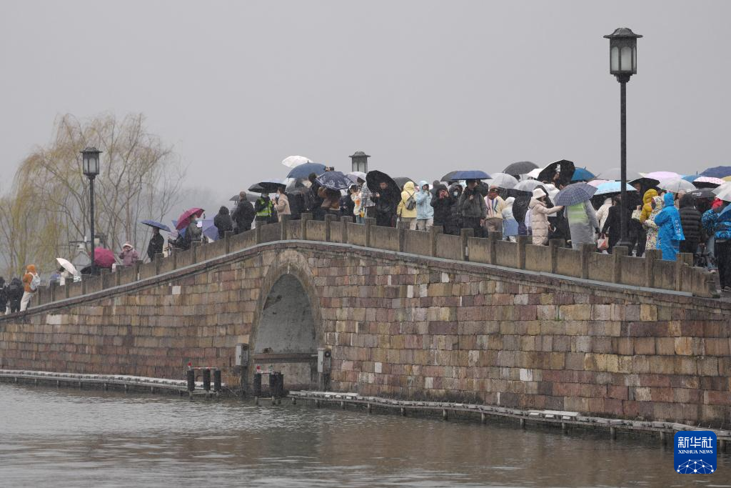 1月20日,游客在杭州西湖景区断桥上赏雪。