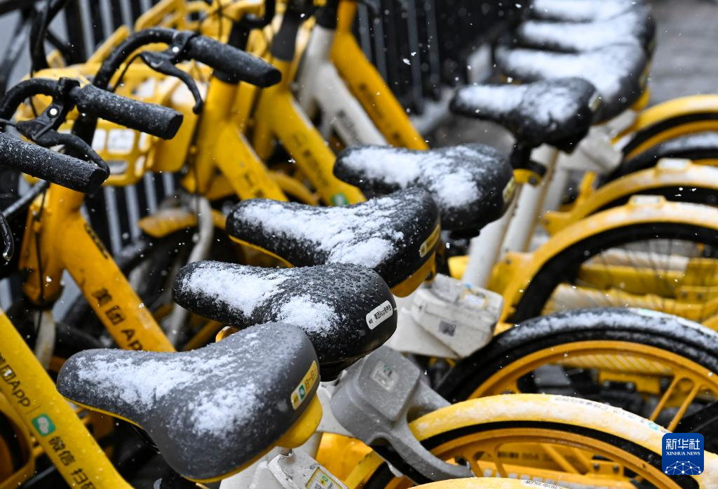 1月20日,在上海市普陀区,街边的共享单车上落有积雪。