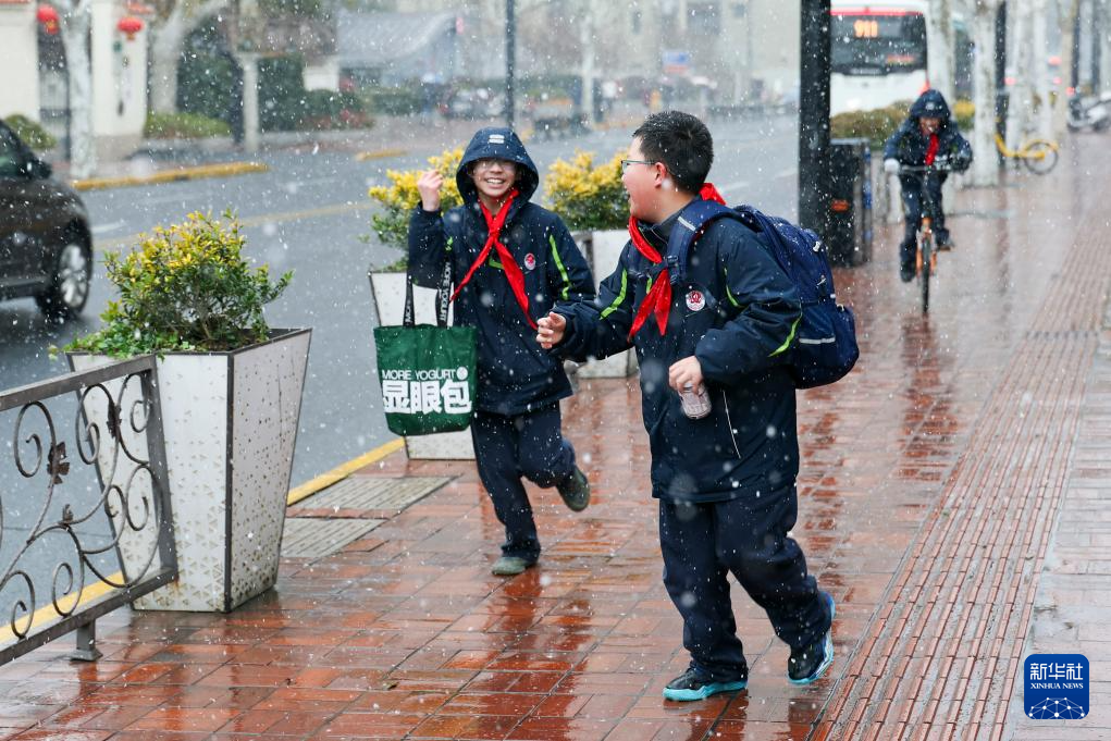 1月20日,小朋友在上海市徐汇区迎雪玩耍。