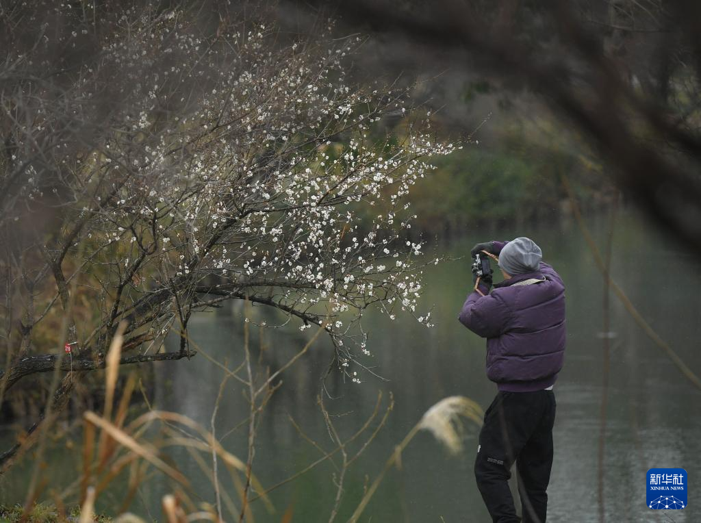 1月20日,在杭州西溪湿地,一名男子在雪中拍摄白梅。
