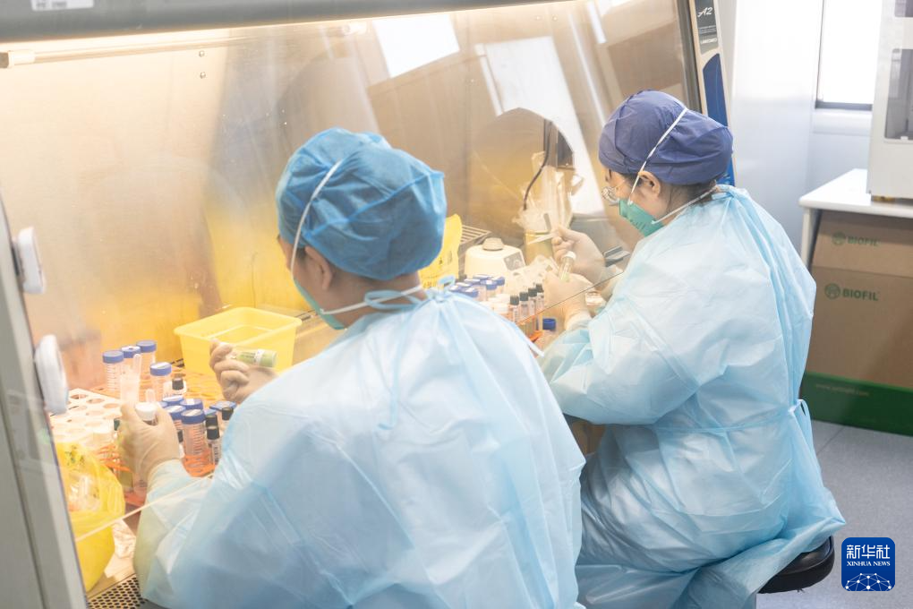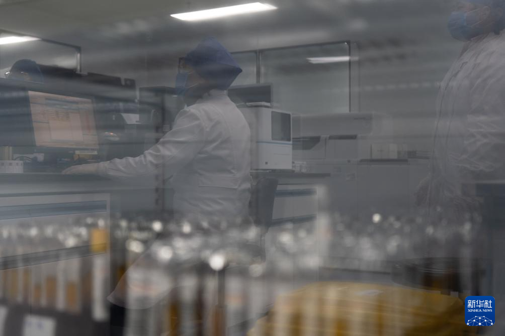 玻璃柜门映射出保健中心医学检验部工作人员忙碌的身影(1月21日摄)。