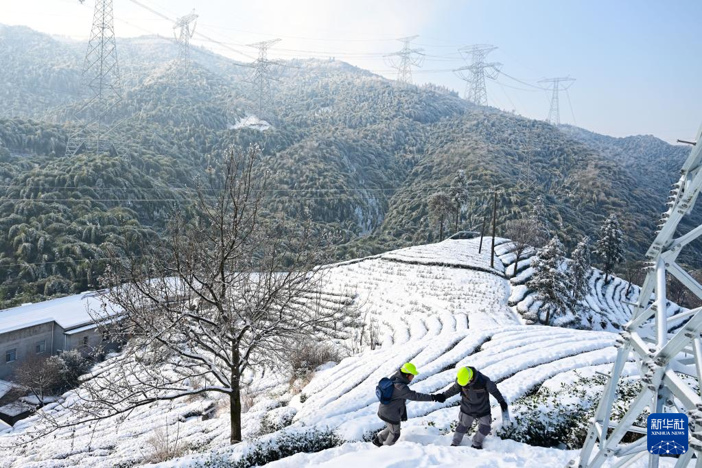 面对寒潮预警,安徽送变电工程有限公司的两名“00后”电网运维人员顾庆谱和李文珂冒雪入驻±500千伏宜华线1151号覆冰观测站。