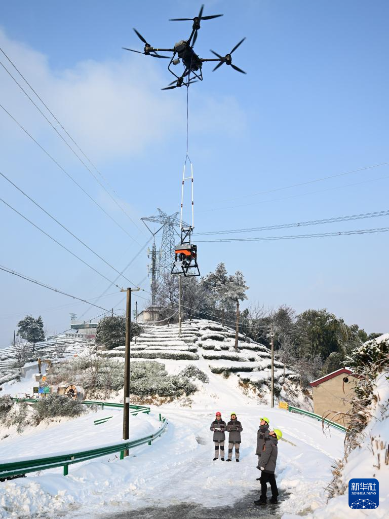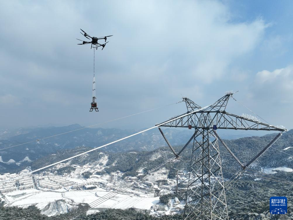 1月21日,顾庆谱操作的载重无人机将除冰机器人吊运至±500千伏宜华线上,准备清除地线覆冰(无人机照片)。