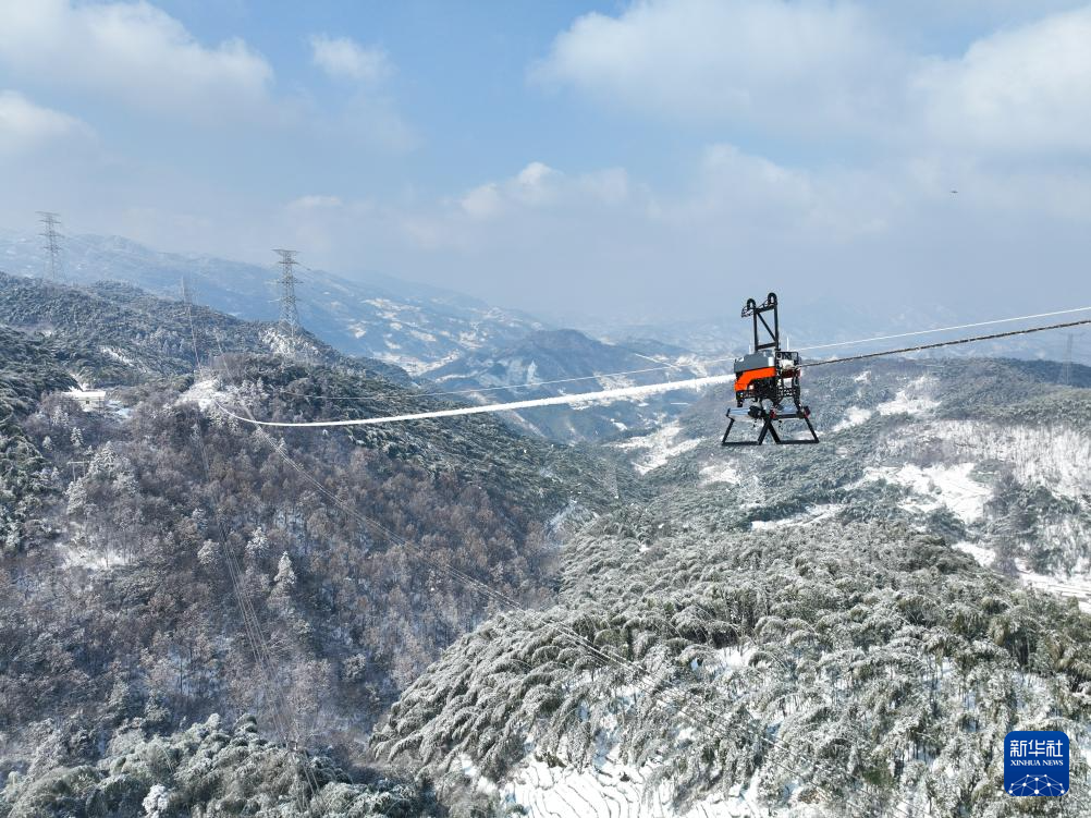 1月21日,除冰机器人在±500千伏宜华线上清除地线覆冰(无人机照片)。