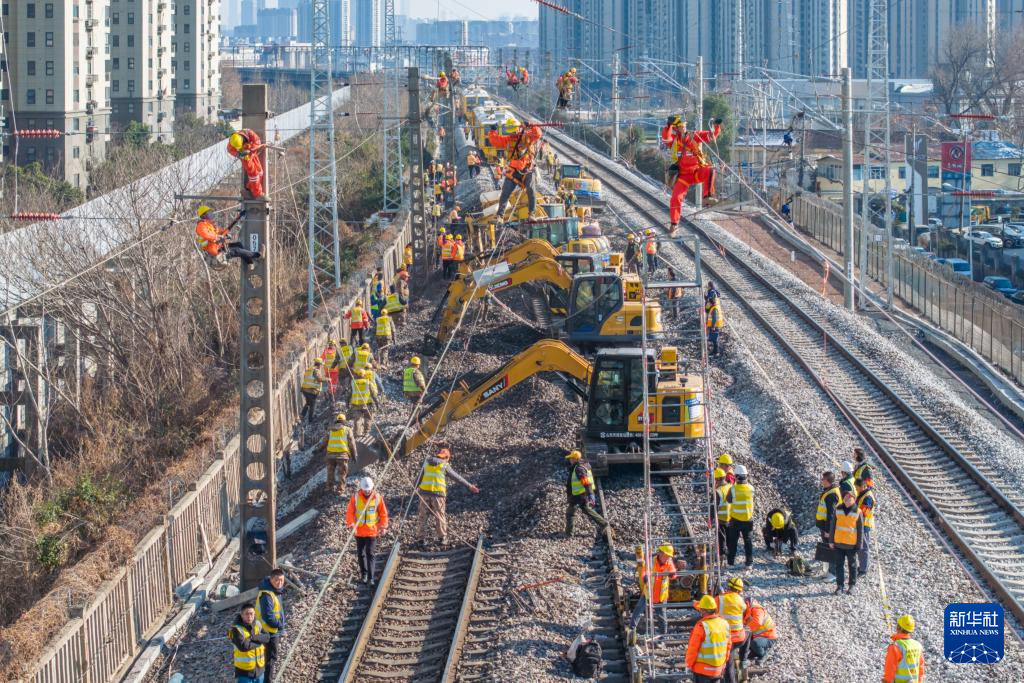 1月22日,在位于江苏省南京市浦口区的京沪线林场站,铁路工务、供电、电务等专业的职工在进行联合封锁施工作业。