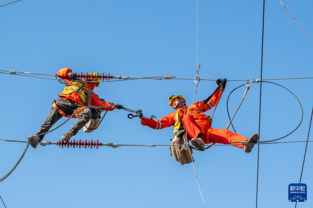 1月22日,在位于江苏省南京市浦口区的京沪线林场站,铁路供电职工在进行接触网施工作业。
