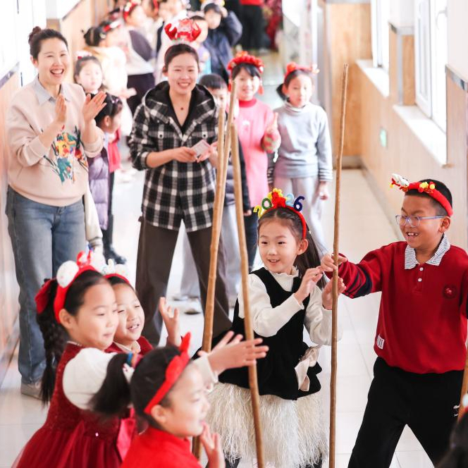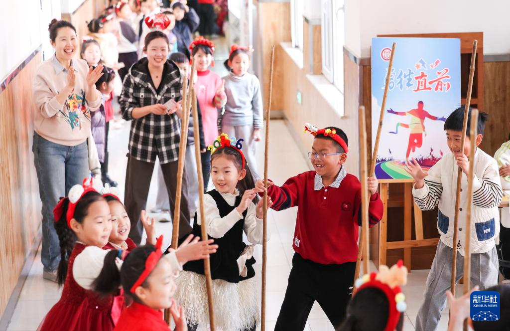 1月22日,在河北省石家庄市仁华小学“乐考”活动中,小学生们进行“敏捷小腾马”趣味游戏。
