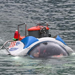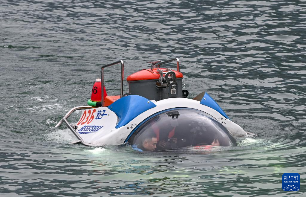 近日,由重庆巫山本土科技企业坤联机械制造有限公司自主研发制造的“鲛子”号水下载人观光潜水器在双龙湖进行交付前的测试。