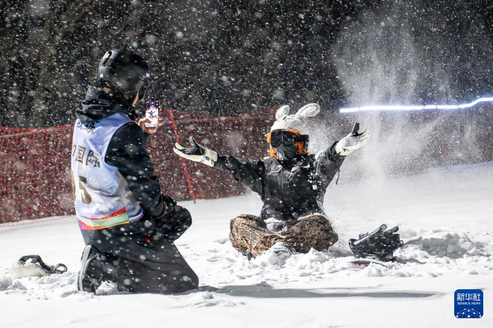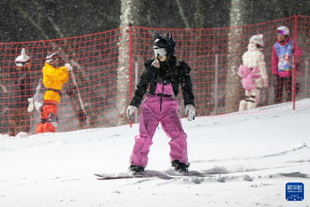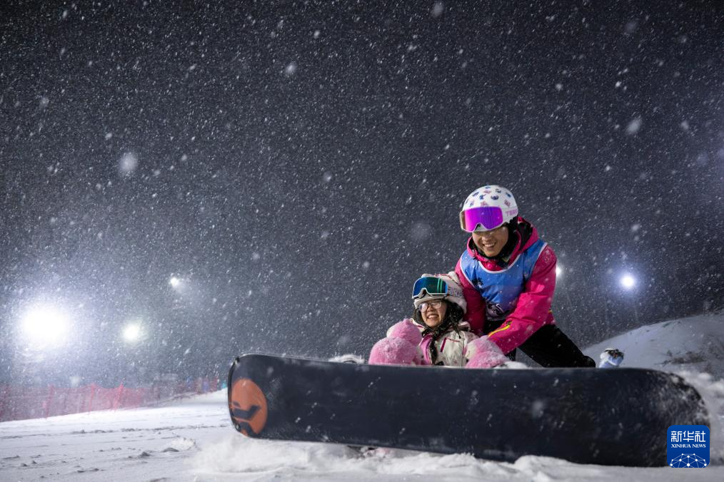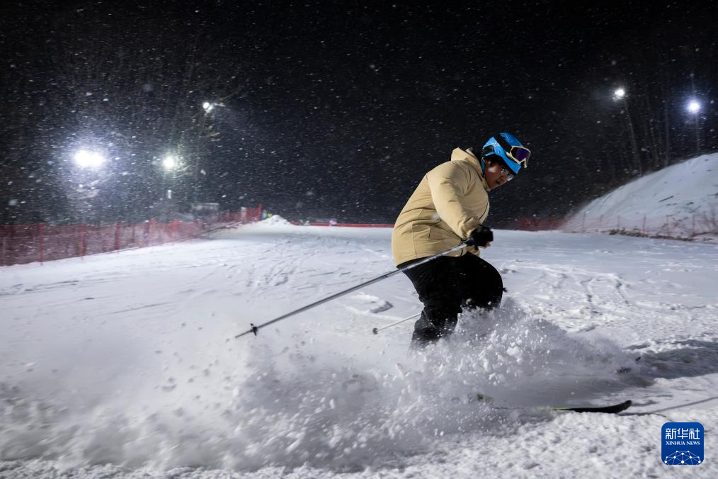 1月19日,游客在神农架中和国际滑雪场体验夜场滑雪。