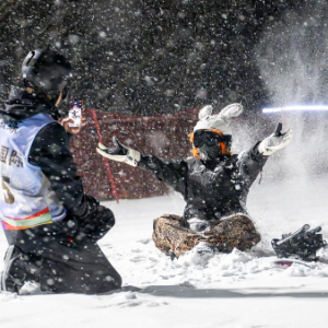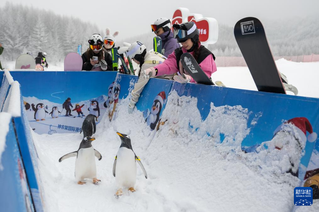 1月20日,游客在神农架国际滑雪场与企鹅互动。