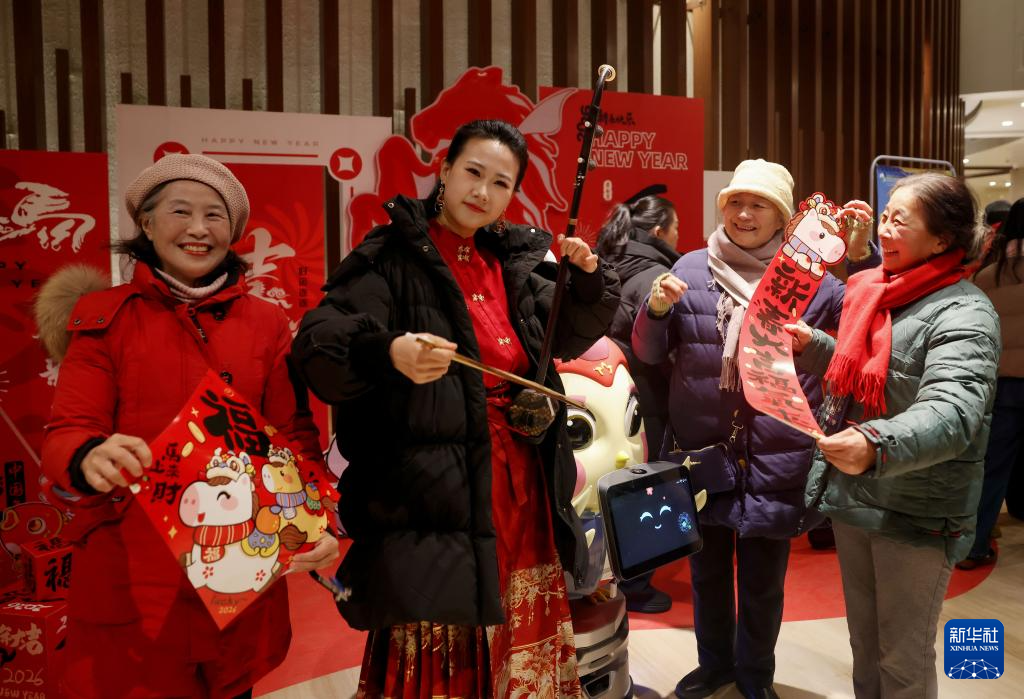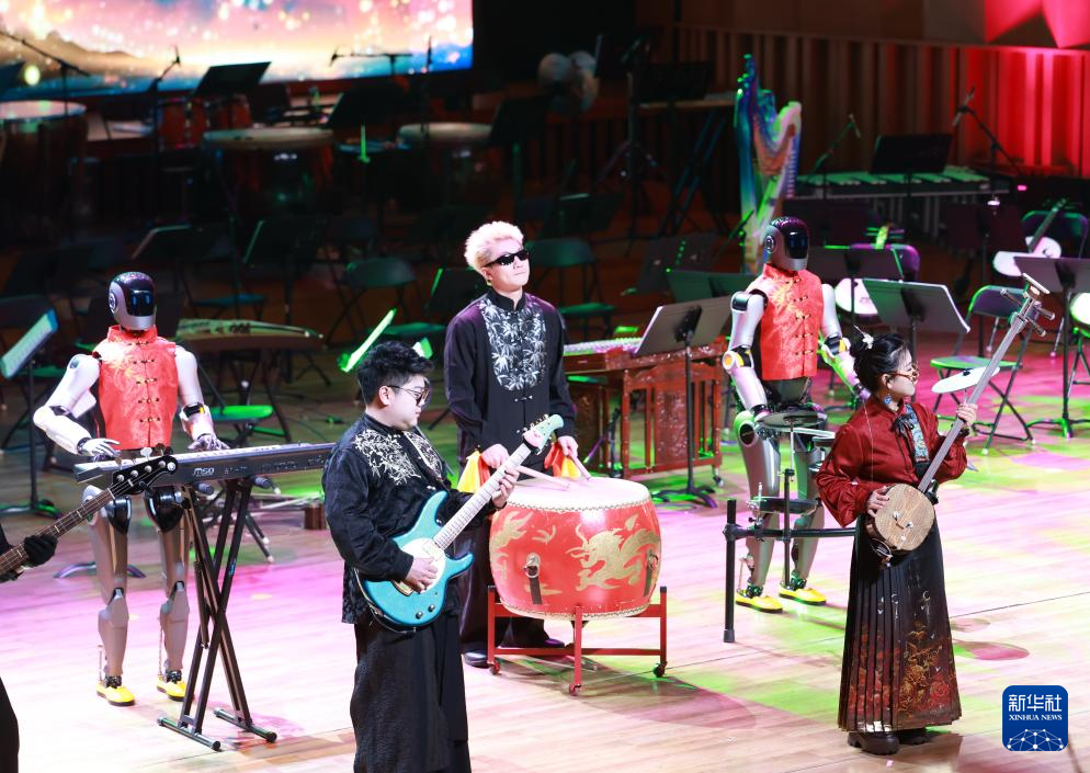 1月23日,在湖北省迎新春新民乐惠民展演现场,机器人与演员同台为观众表演节目。