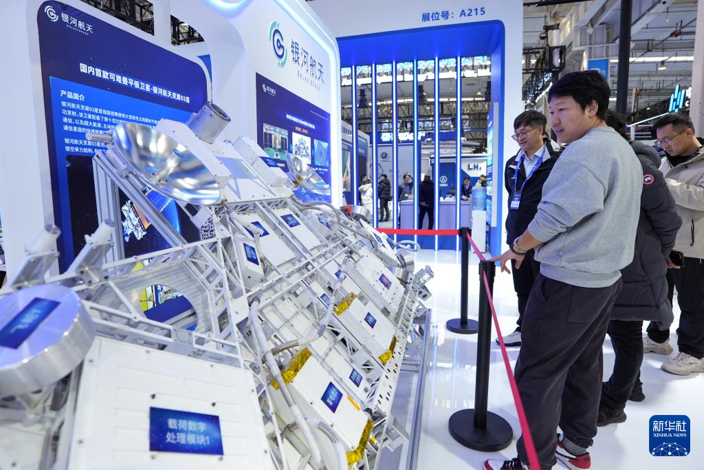 1月23日,观众在2026北京国际商业航天展的银河航天展台参观展出的可堆叠平板卫星“灵犀03星”模型。