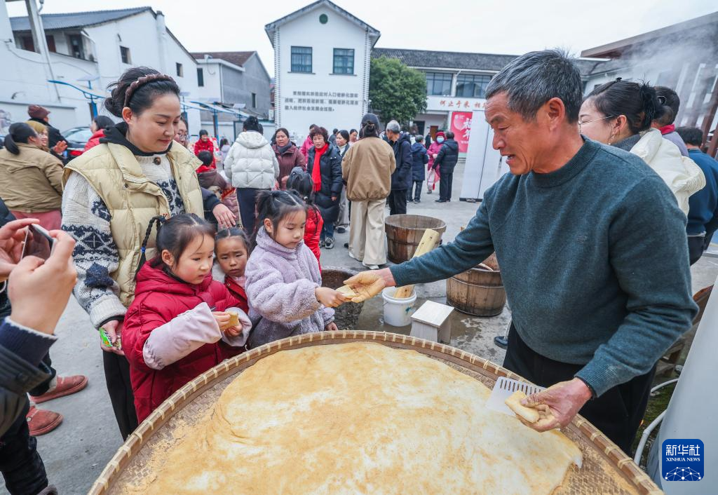 1月23日,孩子们在东白湖镇乡村年味大集上品尝刚刚做好的麻糍。